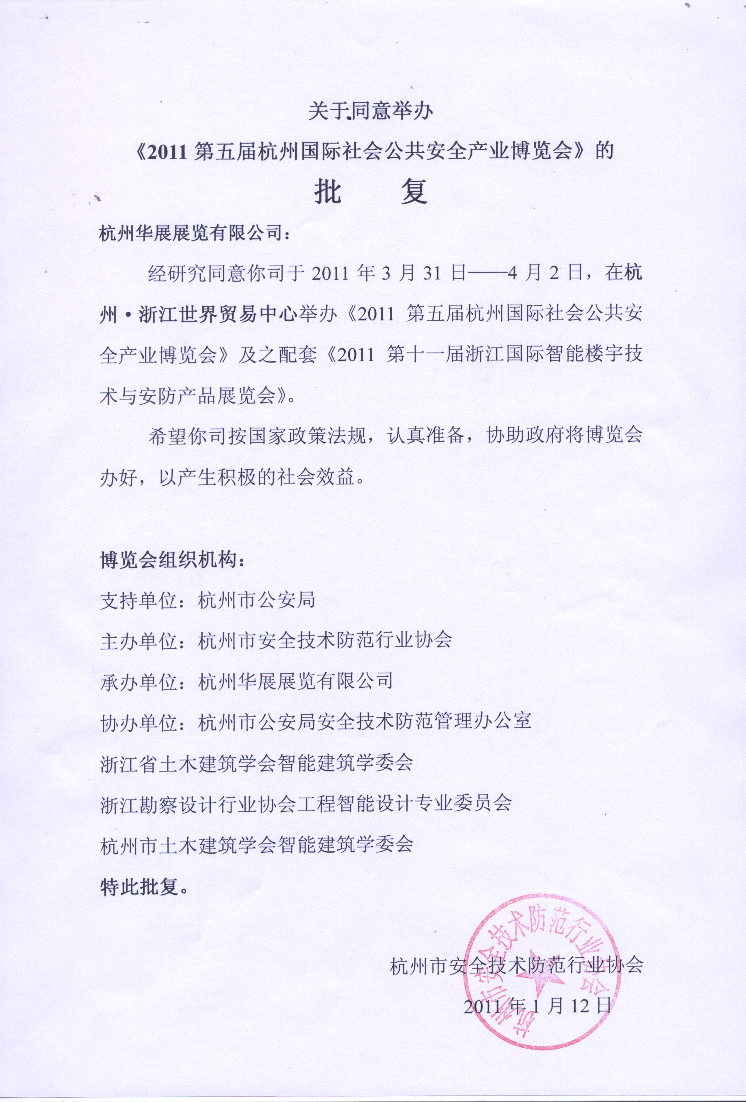 關于同意舉辦《2011第五屆杭州國際社會公共安全產業博覽會》的批復